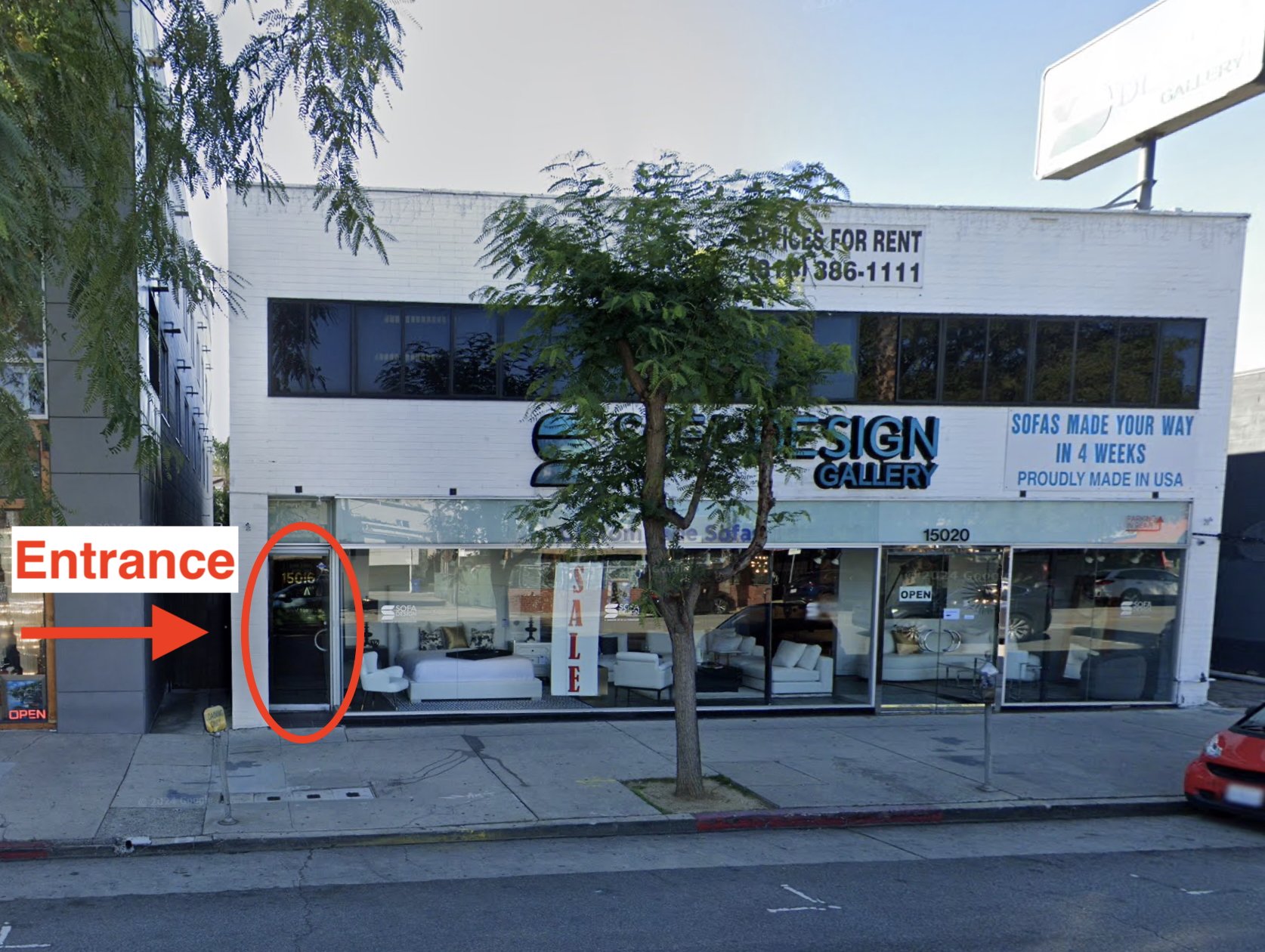 The studio is located on 15020 Ventura Blvd in Sherman Oaks. The entrance is the glass door on the left side of Sofa Design Gallery. Head upstairs to Suite 7.